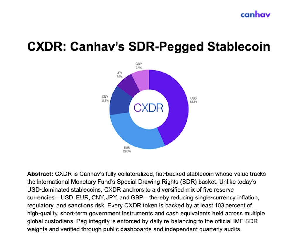 I’m excited to share the first public draft of the CXDR white‑paper, now live on canhav.com. CXDR is the fiat‑backed stablecoin that tracks the IMF’s Special Drawing Rights (SDR) basket rather than a single currency, giving businesses and DeFi builders a built‑in hedge against dollar‑only exposure. The document outlines CXDR’s reserve model (103 % collateral in five major currencies), multi‑sig treasury controls, and roadmap to on‑chain roll‑ups for sub‑cent transfers.
