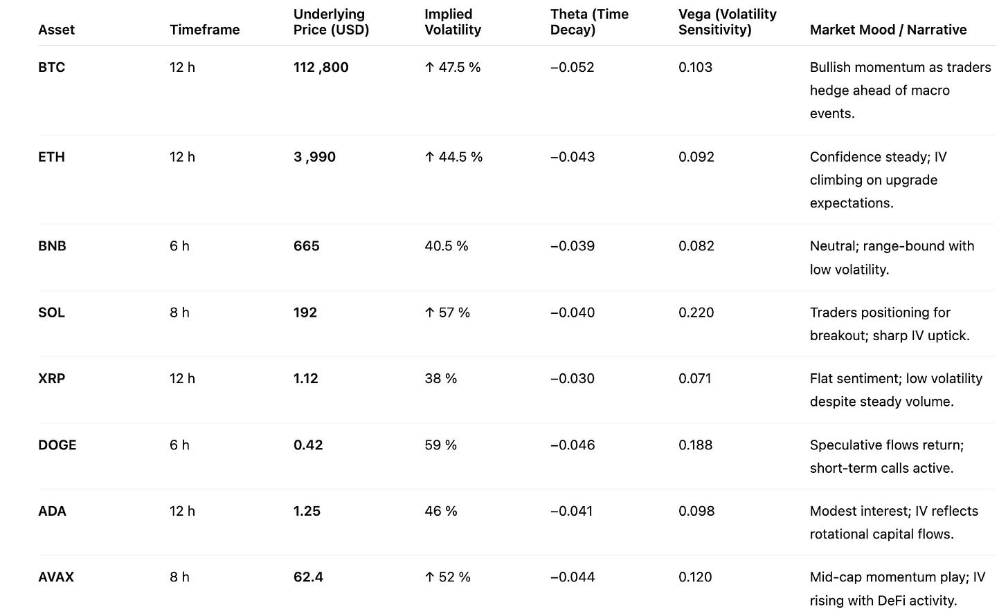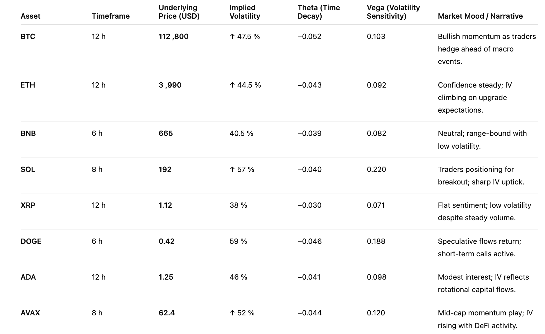 In contrast, BNB, XRP, ADA, and AVAX stayed relatively calm, with low Vega and mild Theta decay, typical of mid-term positioning rather than day trading frenzy.